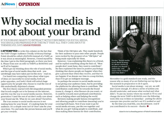 Two key rules for social media are discussed in the article above originally printed in Adnews. It’s also the reason why everyone now refers to TARPS as BANANAS.